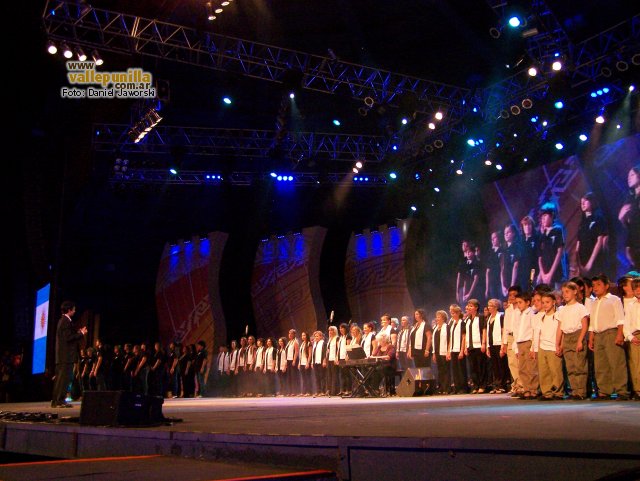 El escenario entonces fue colmado por numerosos coreutas que no sólo con su voz, sino también a través del lenguaje de señas, interpretaron el Himno Nacional Argentino, bajo la dirección de Marcelo E. del Río, al que se sumó toda la plaza.